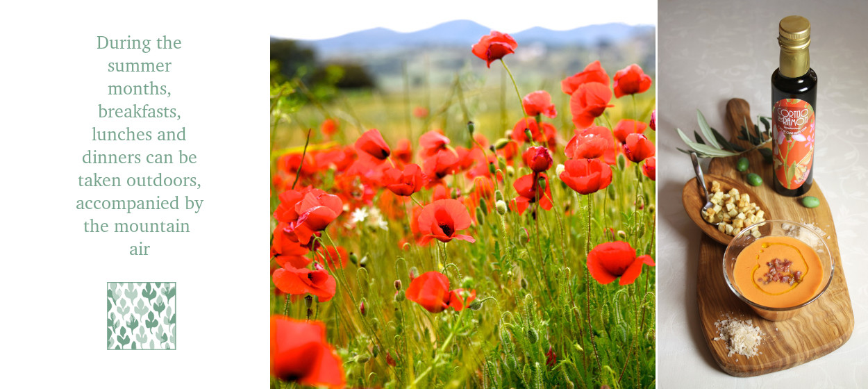 For breakfast, we bake a soft cake that morning and the toast comes out of the village's bread oven. We complete the breakfast with orange juice, fruit, jams, cereals, sausages, yogurts and if you need more energy, eggs from our henhouse, fried, scrambled or to your taste.